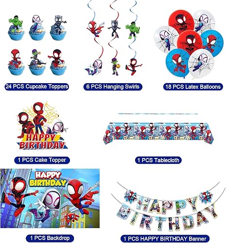 Spidey Birthday Decorations, Party Supplies Set Include Banner, Backdrop, Balloons, Hanging Swirls, Cake Cupcake Toppers, Tablecloth for Boys Girls Spidey Theme Party