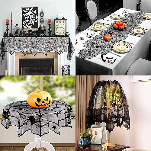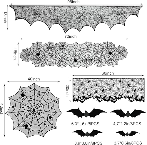 Perfect Size: Halloween fireplace mantel scarf is 96x18 in, spiderweb table runner is 72x18 in, cobweb lampshade cover is 60x20 in, Halloween lace round tablecloth is 40" in diameter. There are 32 pcs bats, including 4 different sizes. All of these decor are very convenient to use and add a little Halloween fun to your house