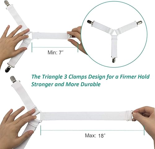 Bed Sheet Fasteners, Adjustable Mattress Suspenders, Mattress Cover Straps, Bed Corner Holder and Keepers and the Bed Sheet Grippers Clips (Triangle White Set of 4)(2 Sets - 8 Straps)