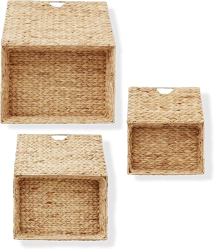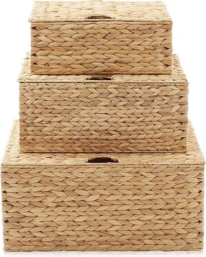 Casafield Set of 3 Water Hyacinth Rectangular Storage Baskets with Lids (Espresso - Small/Medium/Large) for Bedroom, Bathroom, Laundry, Home Office(Natural - Hyacinth,Set of 3 - Small- Medium- Large)