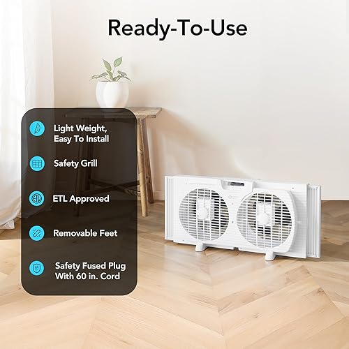 VERSATILE REVERSIBLE FUNCTION: Take advantage of the manual reverse option provided by this twin blade window fan. With this feature, you can switch between two modes of operation. Draw cool and refreshing air into your home by using the intake function, ensuring a comfortable and rejuvenating atmosphere. Alternatively, use the exhaust function to effectively push hot and stale air out of the room, promoting better ventilation and air circulation. Embrace the versatility and control offered by this fan.