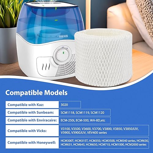 WF2 Filter for Vicks humidifier 3000 Series: V3100, V3500, V3500N, V3600, V3700, V3800, V3850, V3850JUV, V3900, V3900JUV, VEV320, VE4000, for Starry Night & for Vaporizer. Compatible with Sunbeam 1118, 1119, 1120, for Robitussin DH835, for ReliOn WA-8D, for Kaz 3020, for Enviracaire ECM-250i & ECM-500. Compare to Part # PWF2