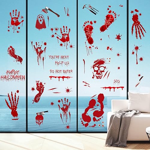 SPOOKY DECOR: These terror bloody handprint and footprint window stickers add a chilling touch to your Halloween decorations