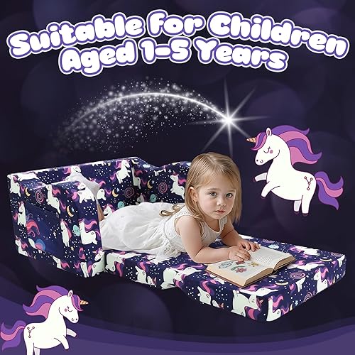 MeMoreCool Toddler Chair Comfy 1-3 Years Old, Kids Couch for Playroom, Convertible Glowing Dinosaur Flip Out Sofa, Kids Furniture Floor Recliner Chair Bed(Navy Unicorn,Print)