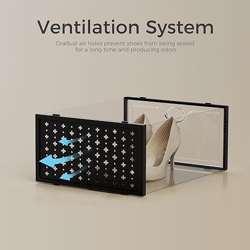 【Clear yet Breathable】Shoe Organizers can protect your shoes from dust and water.Clear shoe boxes with clear front door allows you easily find the shoes you want in a simple glimpse and take them out.The back frame is porous and very breathable but still dust free so you don't have to worry about odor bothering you.