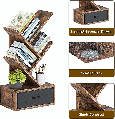 Rolanstar 7 Tier Bookshelf with Drawer, Tree Bookshelf, Small Bookshelves with Storage Rack for CDs/Movies/Books, Standing Book Shelf, Tall Narrow Bookcase for Living Room, Bedroom, Rustic Brown(Rustic Brown,4 Tier)