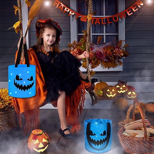 Sadnyy 3 Pcs Halloween Trick or Treat Bags Light up for Kids Pumpkin Candy Bucket LED Halloween Treating Baskets Reusable Goody Tote Bag for Party Favor Supplies(Green, Blue, Orange)(Blue)