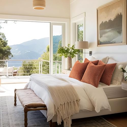 Topfinel Fall Burnt Orange Decorative Throw Pillows Covers 18x18 Inch Set of 4,Yellow Green Gradient Series Corduroy Striped Square Pillow Case,Western Modern Cushion Cover for Couch Sofa Bedroom(Terracotta,16" x 16" (Pack of 4))