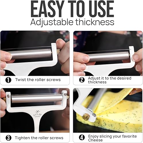 SLICE CHEESE LIKE A PRO: You no longer need to buy processed cheese slices, as this wire cheese slicer can cut cheese from paper-thin to ¼” thick slices and can also slice up cheese blocks up to 3.8” wide. Manually adjust the thickness of the wire slicer to get cheese just the way you prefer.